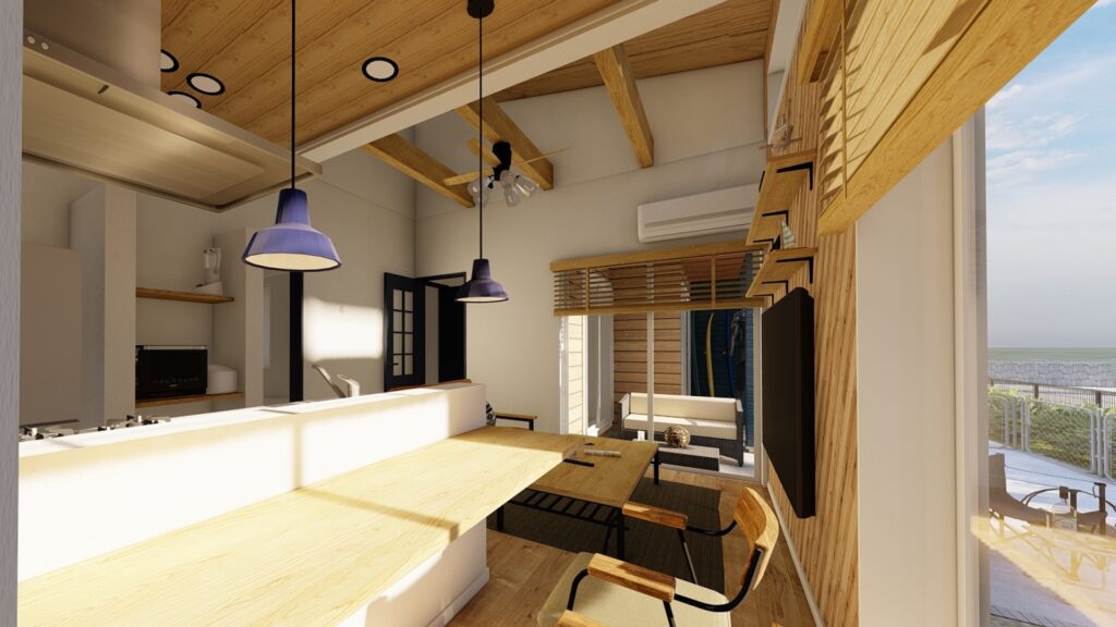 一枚板を中心に、自然と人のぬくもりを感じる空間を構成すれば、「穏やかな時間が流れる癒しの別荘」が完成します。